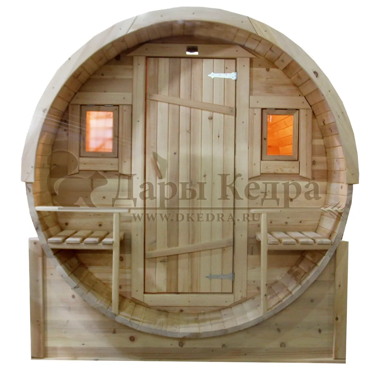 Это изделие круглой вытянутой формы с одним парильным отделением. Внутреннее пространство включает в себя печь у дальней стены и лавки из кедра по обе стороны бани. За счет компактной формы баня нагревается в течение 30 минут. По вашему желанию ее можно укомплектовать козырьком, верандой и печью с внешней загрузкой, благодаря которой весь мусор после топки остается на улице. Круглая баня-бочка не требует полноценный фундамент, поэтому при необходимости ее можно перенести в другое место.