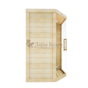 Это специально оборудованная готовая деревянная кабина для сухого и влажного парения. Электропечь нагревает пространство внутри и позволяет сбрызгивать камни водой, слегка увлажняя воздух. Такая процедура позволяет избежать перегрева. Каркас сауны выполнен из массива кедра, снаружи и внутри обшит липовой вагонкой сорта «Экстра» и имеет теплоизоляционный слой. Также двухуровневый полок идёт из кедра для обогащения внутри кабины полезными фитонцидами, а в сочетании с противовирусными свойствами липы сауна становится настоящим источником здоровья.