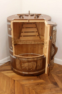 Это круглая фитобочка из кедра увеличенных размеров с толщиной стенок 45 мм. Подходит для людей высокого роста и крупной комплекции. Фитобочка оборудована откидными створками, дверцей и отверстием для головы. Во время парения человек сидит внутри кедровой бочки, а голова находится снаружи. Благодаря этому исключается возможность перегрева. Подлокотники из кедра, встроенные ручки на створках и двери делают эксплуатацию более удобной.