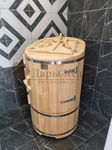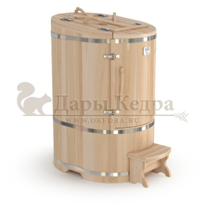 Готовый комплект - это полностью укомплектованный набор с фитобочкой для процедур парения. Овальная модель более просторна и удобна в использовании. Толщина стенок составляет 25 мм. Бочка оборудована откидными створками, дверцей и отверстием для головы. Верхний скос изделия делает положение головы более комфортным и улучшает обзор. Во время парения человек сидит внутри кедровой бочки, а голова находится снаружи. Благодаря этому исключается возможность перегрева. Подлокотники из кедра, встроенные ручки на створках и двери делают эксплуатацию более удобной.