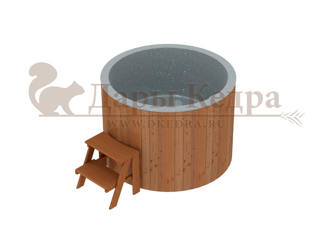 • Бондарная круглая купель из кедра с пластиковой вставкой Особенность этой модели заключается в сборке купели по технологии лунный-паз. Паз (углубление) одной доски прочно соединяется с выемкой следующей. Такая сборка осуществляется без клея и гвоздей. Готовая конструкция прочно фиксируется нержавеющими обручами. Пластиковая вставка придает изделию красивый внешний вид, увеличивает срок службы и облегчает уход за купелью. Для удобства пользования купель оснащена лавочками, приставной и внутренней лестницей из кедра. Подходит для комнатного и уличного использования. Купели с пластиковой вставкой рекомендуется заказывать для непрерывного использования в банных комплексах или оздоровительных центрах. Внутренняя чаша облегчает уход за изделием и увеличивает срок службы купели.