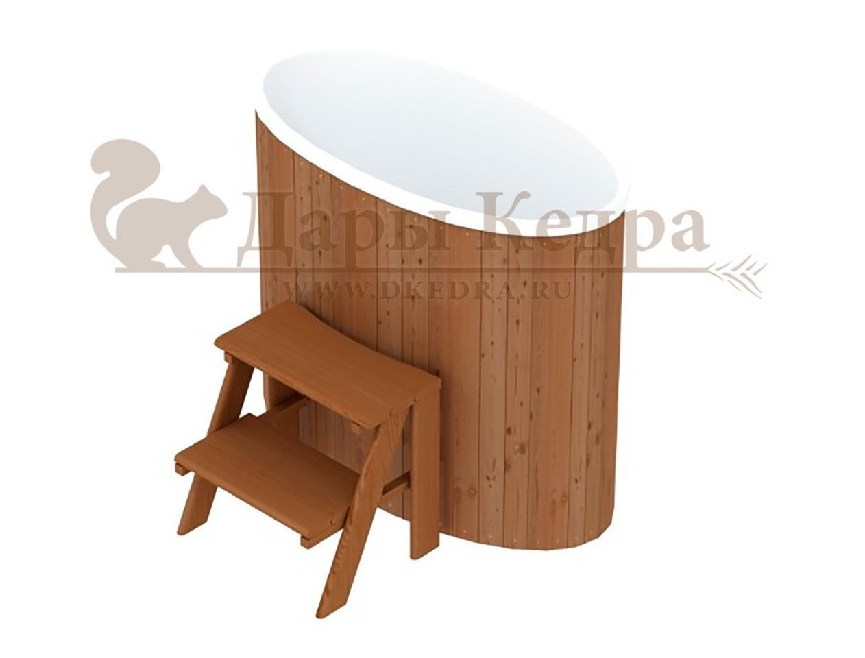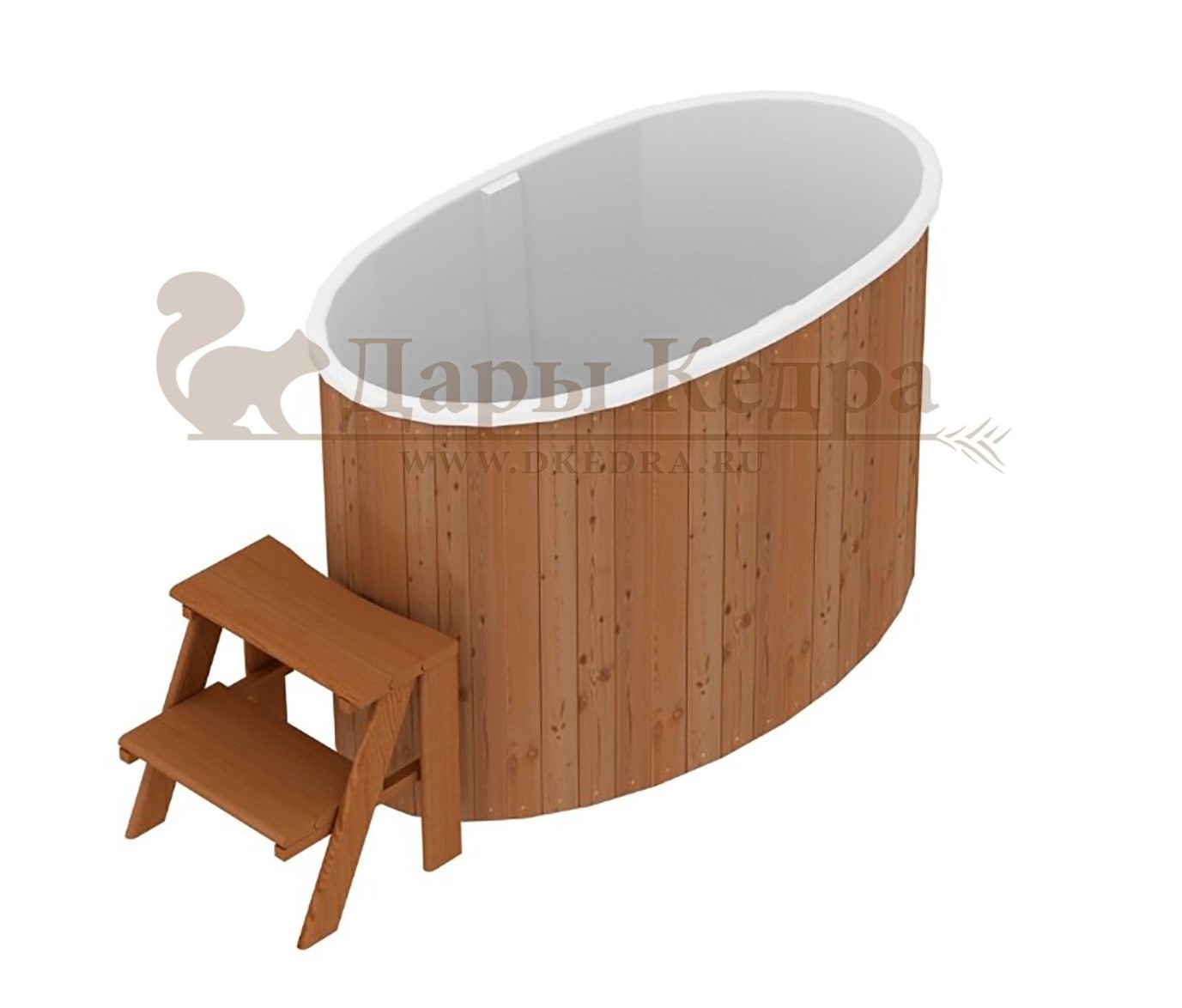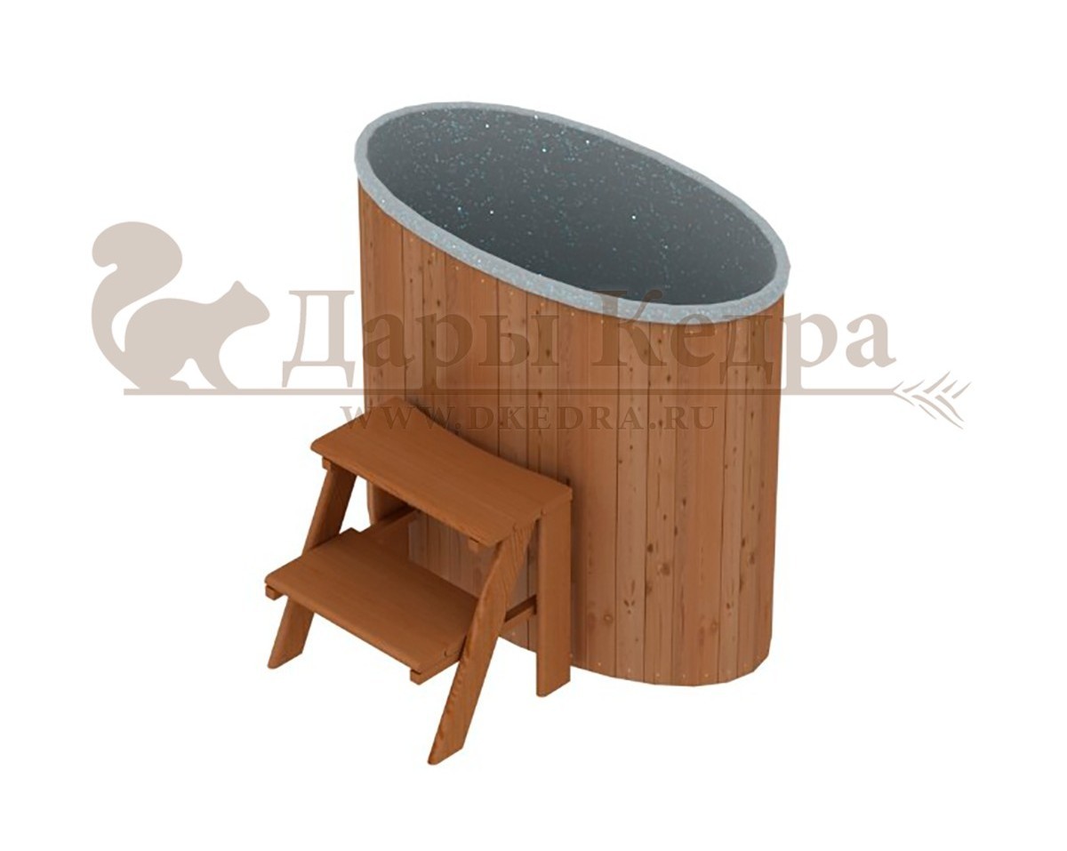 • Бондарная овальная купель из кедра с пластиковой вставкой Особенность этой модели заключается в сборке купели по технологии лунный-паз. Паз (углубление) одной доски прочно соединяется с выемкой следующей. Такая сборка осуществляется без клея и гвоздей. Готовая конструкция прочно фиксируется нержавеющими обручами. Пластиковая вставка придает изделию красивый внешний вид, увеличивает срок службы и облегчает уход за купелью. Для удобства пользования купель оснащена лавочками, приставной и внутренней лестницей из кедра. Подходит для комнатного и уличного использования. Купели с пластиковой вставкой рекомендуется заказывать для непрерывного использования в банных комплексах или оздоровительных центрах. Внутренняя чаша облегчает уход за изделием и увеличивает срок службы купели.