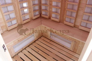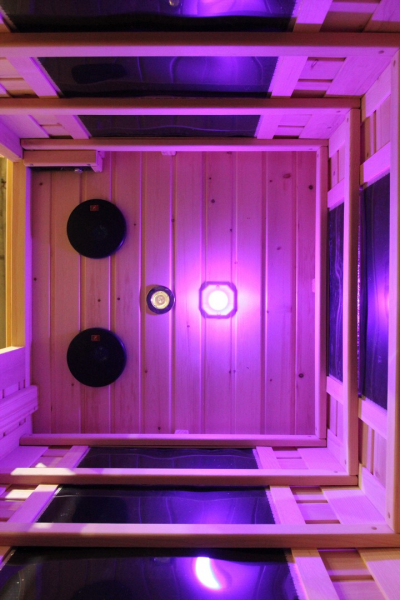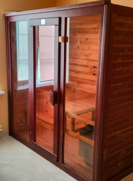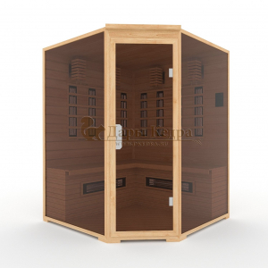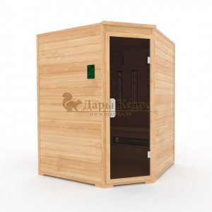 Это специально оборудованная кедровая кабина для прогрева тела человека сухим теплом. Воздух в таких парных не нагревается. Инфракрасные лучи воздействуют на тело, равномерно прогревая мышцы, суставы и органы. Керамические излучатели похожи на лампы, имеют высокую температуру нагрева, поэтому защищены противоожоговыми решетками. Тело человека в таких саунах нагревается интенсивнее. Работает кабина за счет электричества. Установка сауны в угол, позволяет рационально использовать пространство помещения. Эта вместительная модель подходит для коммерции.