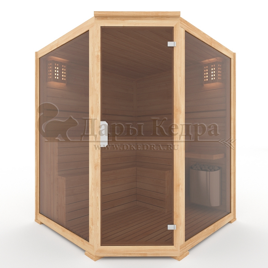 Трехместная угловая финская сауна кабина из кедра с электрокаменкой Это специально оборудованная деревянная кабина для сухого и влажного парения. Электропечь нагревает пространство внутри и позволяет сбрызгивать камни водой, слегка увлажняя воздух. Такая процедура позволяет избежать перегрева. Двойные стенки кабины с теплоизоляционным материалом удерживают тепло. Установка сауны в угол позволяет рационально использовать пространство помещения. Финская сауна с электропечью подойдет как для домашнего использования, так и для коммерции. Доставляется в разборном виде щитами, собирается по инструкции с помощью шуруповёрта. Обращаем Ваше внимание, что в стоимость сауны уже включена дверь с закаленным стеклом в раме из кедра с фиксатором и деревянным фасадом справа. Вы можете заменить фасад на цельностеклянный с безрамной дверью за дополнительную плату. Нагреваясь, древесина кедра выделяет полезные вещества-фитонциды, которые благотворно влияют на организм в целом и укрепляют иммунитет.