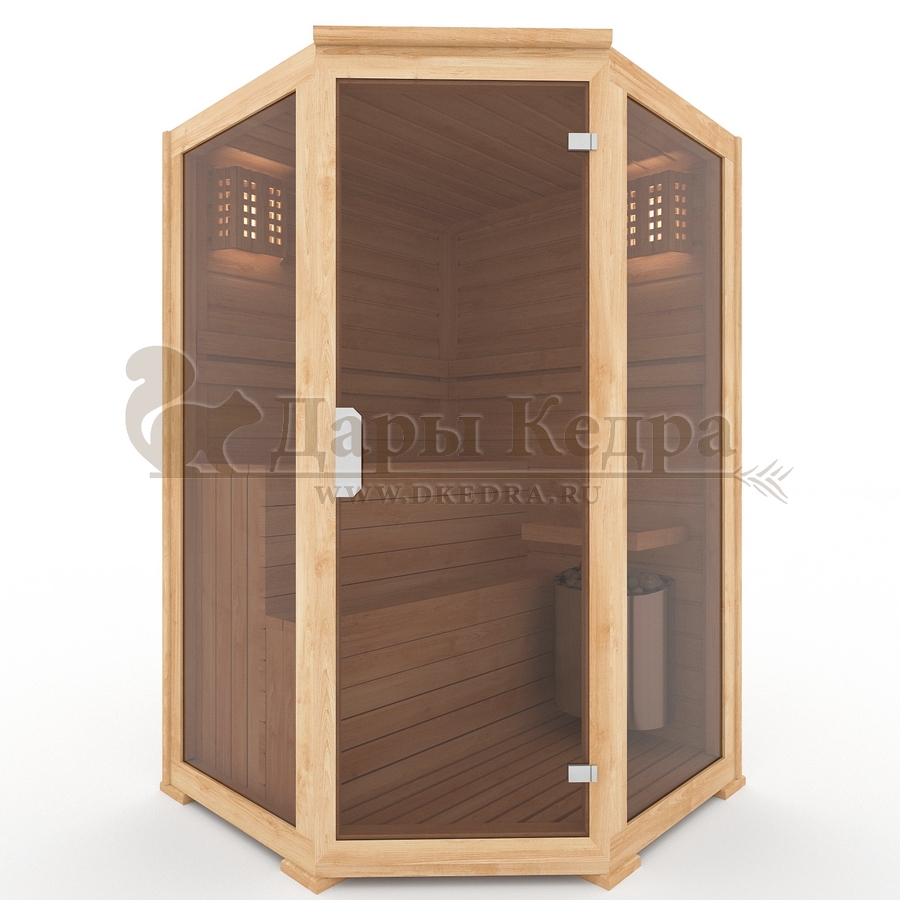 Двухместная угловая финская сауна кабина из кедра с электрокаменкой Это специально оборудованная деревянная кабина для сухого и влажного парения. Электропечь нагревает пространство внутри и позволяет сбрызгивать камни водой, слегка увлажняя воздух. Такая процедура позволяет избежать перегрева. Двойные стенки кабины с теплоизоляционным материалом удерживают тепло. Установка сауны в угол позволяет рационально использовать пространство помещения. Финская сауна с электропечью подойдет как для домашнего использования, так и для коммерции. Доставляется в разборном виде щитами, собирается по инструкции с помощью шуруповёрта. Обращаем Ваше внимание, что в стоимость сауны уже включена дверь с закаленным стеклом в раме из кедра с фиксатором и деревянным фасадом справа. Вы можете заменить фасад на цельностеклянный с безрамной дверью за дополнительную плату. Нагреваясь, древесина кедра выделяет полезные вещества-фитонциды, которые благотворно влияют на организм в целом и укрепляют иммунитет.