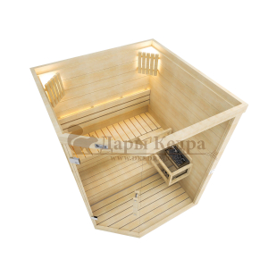Это специально оборудованная готовая деревянная кабина для сухого и влажного парения. Электропечь нагревает пространство внутри и позволяет сбрызгивать камни водой, слегка увлажняя воздух. Такая процедура позволяет избежать перегрева. Каркас сауны выполнен из массива кедра, снаружи и внутри обшит липовой вагонкой сорта «Экстра» и имеет теплоизоляционный слой. Также двухуровневый полок идёт из кедра для обогащения внутри кабины полезными фитонцидами, а в сочетании с противовирусными свойствами липы сауна становится настоящим источником здоровья.