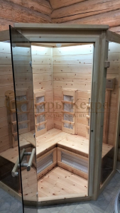 Это специально оборудованная кедровая кабина для прогрева тела человека сухим теплом. Воздух в таких парных не нагревается. Инфракрасные лучи воздействуют на тело, равномерно прогревая мышцы, суставы и органы. Керамические излучатели похожи на лампы, имеют высокую температуру нагрева, поэтому защищены противоожоговыми решетками. Тело человека в таких саунах нагревается интенсивнее. Работает кабина за счет электричества. Установка сауны в угол, позволяет рационально использовать пространство помещения. Подходит как для домашнего использования, так и для коммерции.